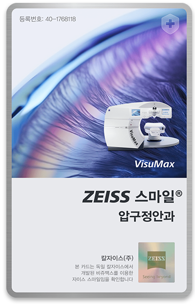 Apgujeong Eye Clinic issues a Zeiss Smile Card to all patients who undergo SMILE LASIK, certifying that their procedure was performed using VISUMAX, developed by Carl Zeiss in Germany.