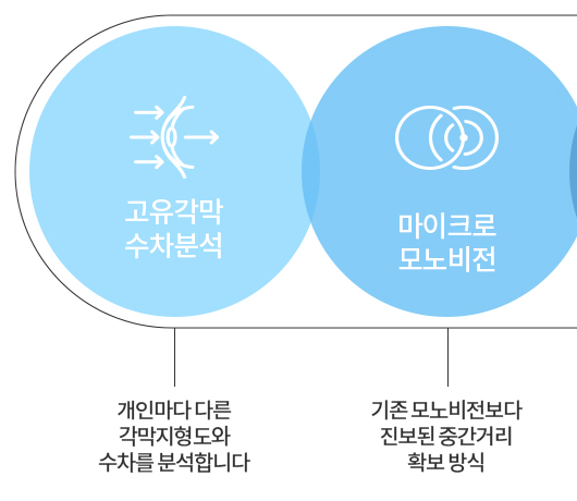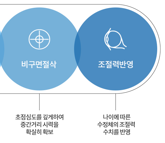 개인의 고유한 각막모양과 조절력을 수치를 반영하여 각막을 비구면 절삭해 초점심도를 깊게 합니다.
